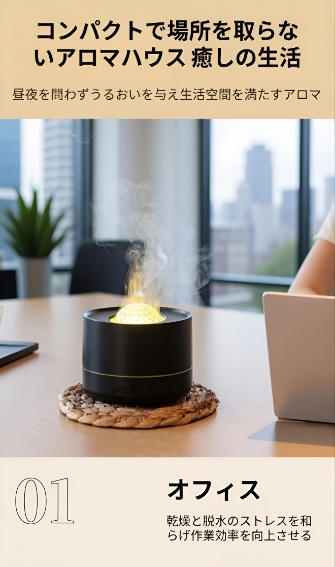 ● 加湿器として乾燥対策ができるだけでなく、アロマディフューザーとしても使用可能なので、香りと潤いを同時に楽しめます。