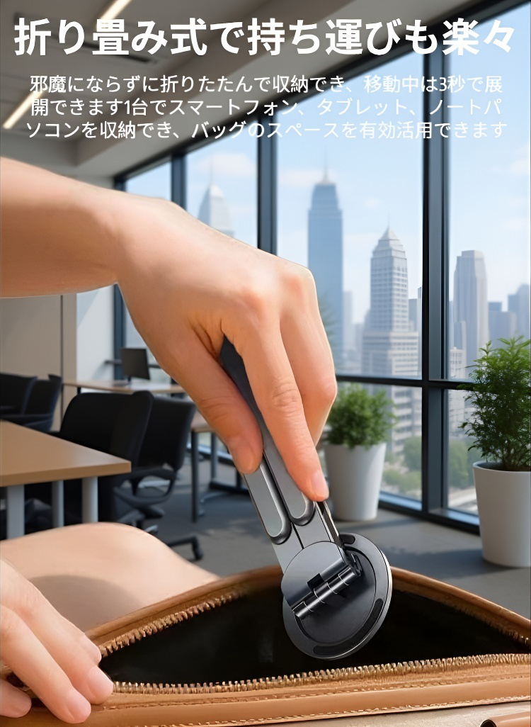 ● コンパクトで持ち運びにも便利。自宅・オフィス・外出先でもスマートに使える多機能スタンドです。